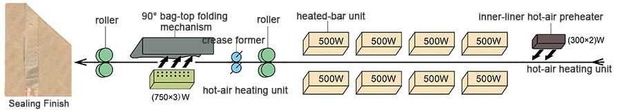 Inner-liner hot-air preheating → inner-liner heat sealing (4 heated-bar groups) → roller pressing → crease-line forming → 90° bag-top folding → hot-air heating (activating the hot-melt coating on the fold) → roller compression