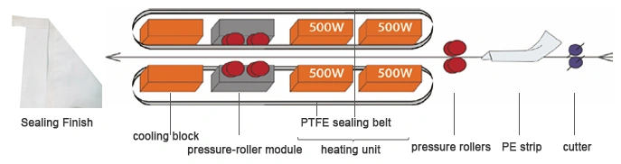Bag mouth trimming (cutter) → PE strip application → Pressure rollers for pre-compression → Heat sealing (2 heated-bar units) → Pressure-roller module compression → Cooling (1 cooling block)